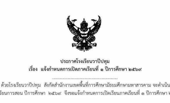 โรงเรียนวาปีปทุมแจ้งกำหนดการเปิดภาคเรียนที่ 1 ปีการศึกษา 2569