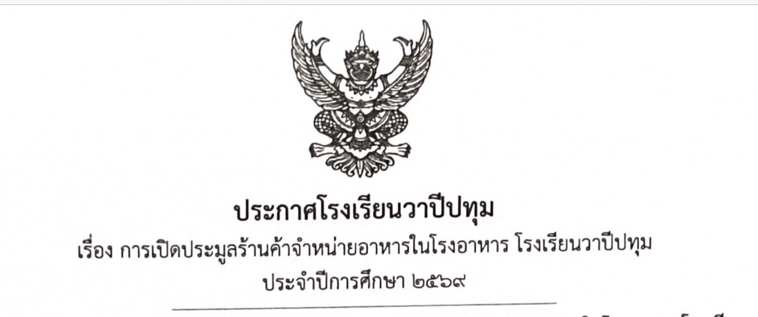 การเปิดประมูลร้านค้าจำหน่ายอาหารในโรงอาหาร โรงเรียนวาปีปทุม ประจำปีการศึกษา 2569