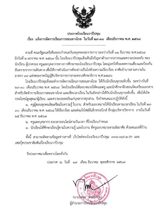 ประกาศโรงเรียนวาปีปทุม แจ้งการจัดการเรียนการสอนทางไกล ในวันที่ 29-30 ธันวาคม พ.ศ.2568