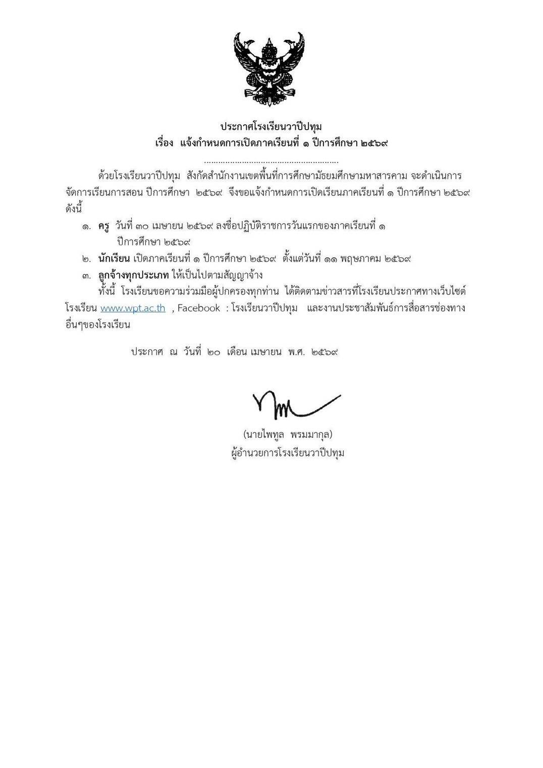 โรงเรียนวาปีปทุมแจ้งกำหนดการเปิดภาคเรียนที่ 1 ปีการศึกษา 2569
