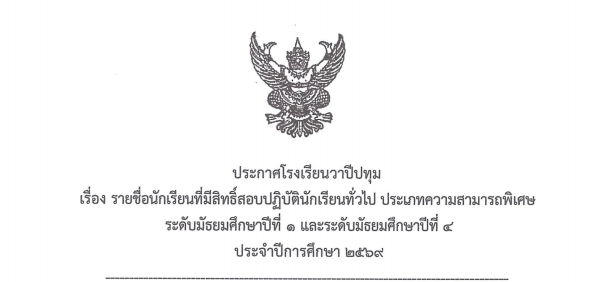 รายชื่อนักเรียนที่มีสิทธิ์สอบปฏิบัตินักเรียนทั่วไป ประเภทความสามารถพิเศษ ระดับชั้น ม.1 และ ม.4 ประจำปีการศึกษา 2569